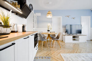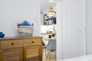 W pełni wyposażony aneks kuchenny spełni wszystkie oczekiwania bez względu na długość urlopu. Posiada m.in. piekarnik, zmywarkę, toster oraz ekspres do kawy.