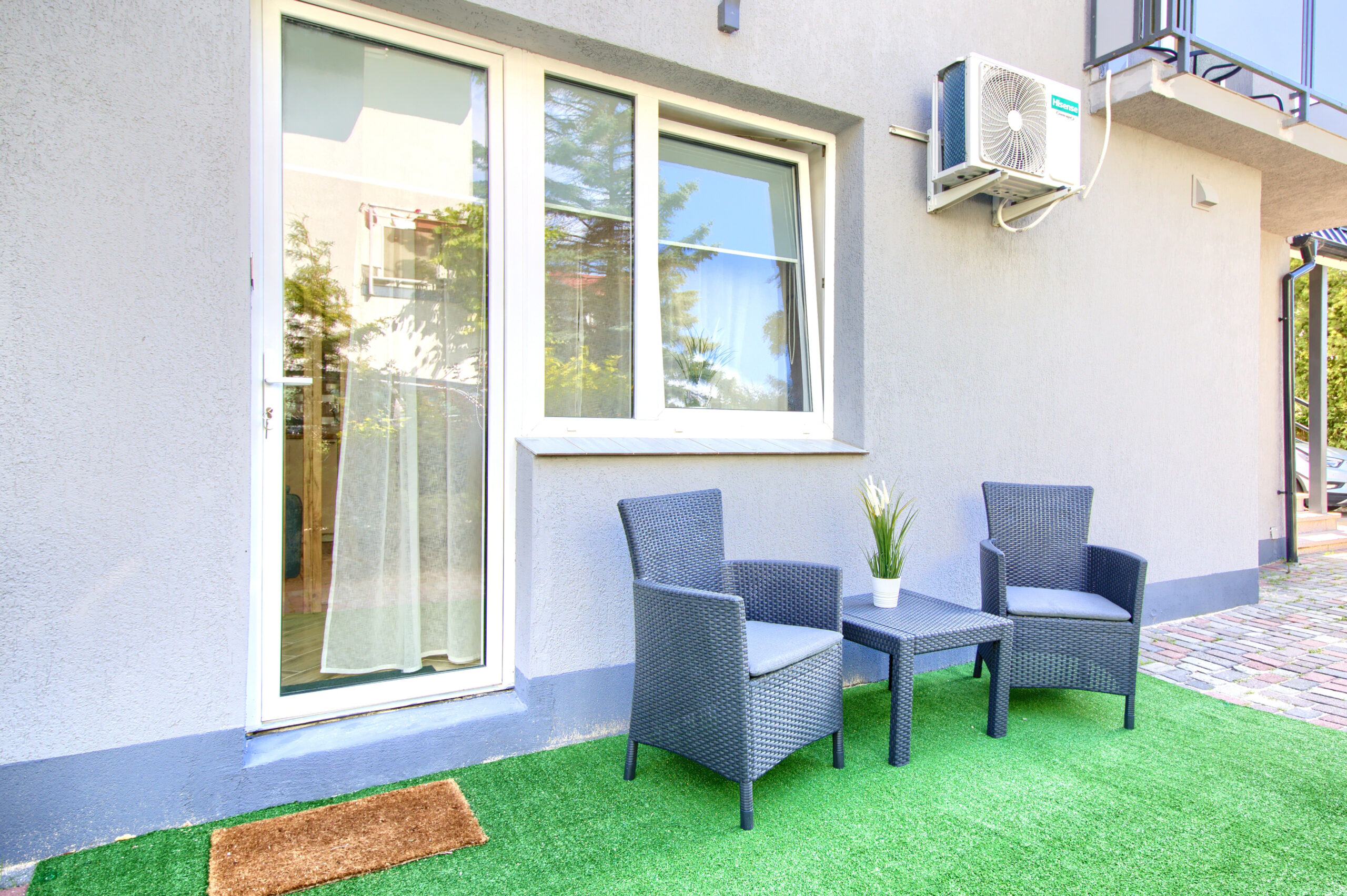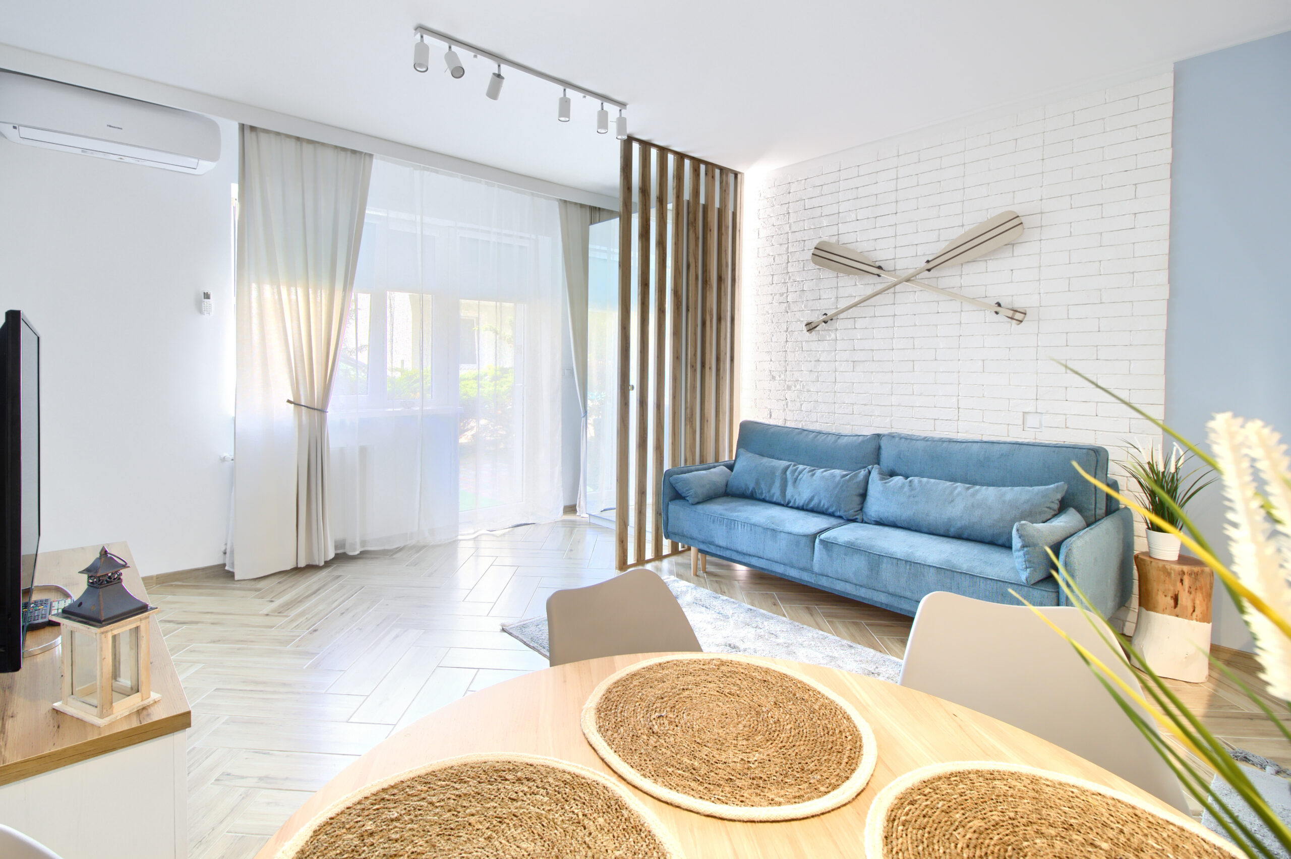 Apartament posiada 2-osobową sypialnię z łóżkiem kontynentalnym 140x200cm. W salonie znajduje się wygodna przestrzeń do odpoczynku z rozkładaną dwuosobową sofą i telewizorem oraz strefa jadalniana ze stołem oraz krzesłami. Mieszkanie jest klimatyzowane.