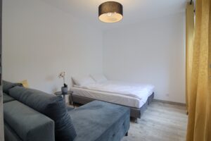 Apartament posiada komfortową sypialnię z wygodnym 2-osobowym łóżkiem 140×200 cm wraz z rozkładanym 2-osobowym narożnikiem .