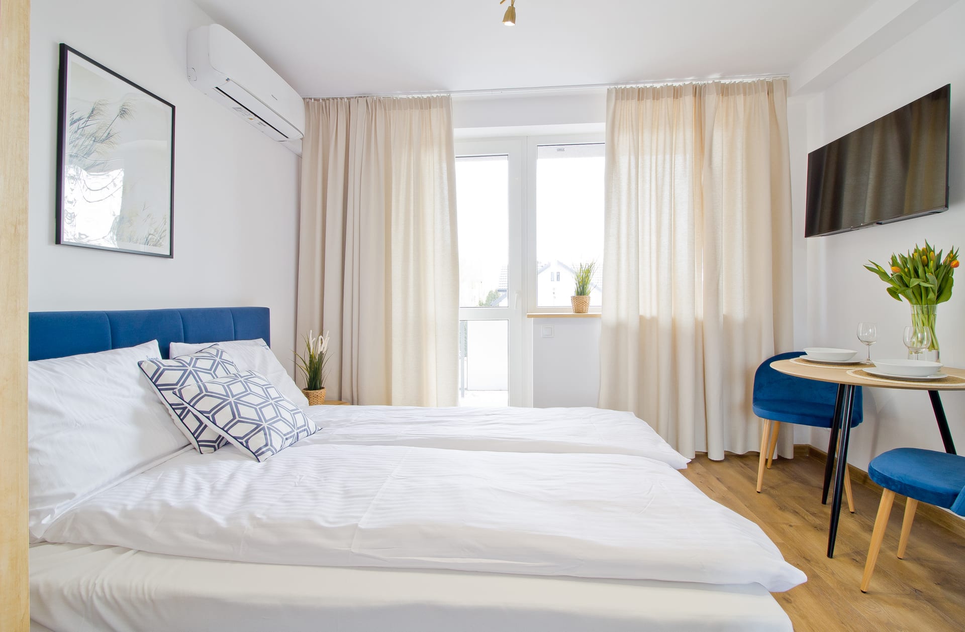 Wystrój mieszkania utrzymany jest w kolorystyce i dodatkach nawiązujących do morskiego klimatu. Dużym atutem mieszkania jest słoneczny balkon, na którym każdy z przyjemnością zje poranne śniadanie i wypije kawę.