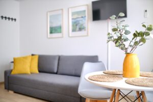 Apartament posiada 2-osobową sypialnię z podwójnym łóżkiem , telewizorem LED oraz przestronną szafą. W salonie znajduje się wygodna przestrzeń do odpoczynku z rozkładaną dwuosobową sofą i telewizorem oraz strefa jadalniana ze stołem oraz krzesłami. Mieszkanie jest klimatyzowane.