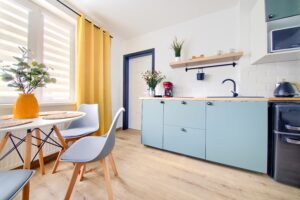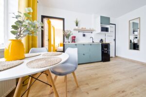 Kuchnia została wyposażona w naczynia i sztućce oraz ekspres do kawy na kapsułki.