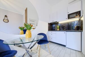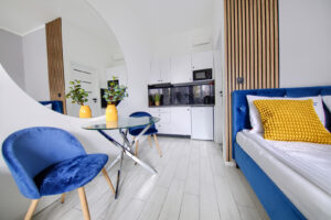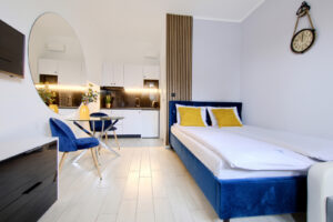 Apartament B2 to niewielkie, ale niezwykle klimatyczne mieszkanie typu studio urządzone w nowoczesnym i przytulnym stylu. Mimo małego rozmiaru, jest bardzo funkcjonalny i został doskonale wyposażony, pozwalając na komfortowy pobyt dla 2 osób lub rodziny z małym dzieckiem.