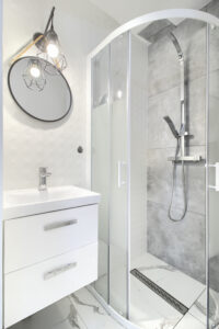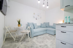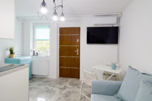 Ta kameralna przestrzeń posiada własny aneks kuchenny wraz z naczyniami oraz łazienkę z kabiną prysznicową.