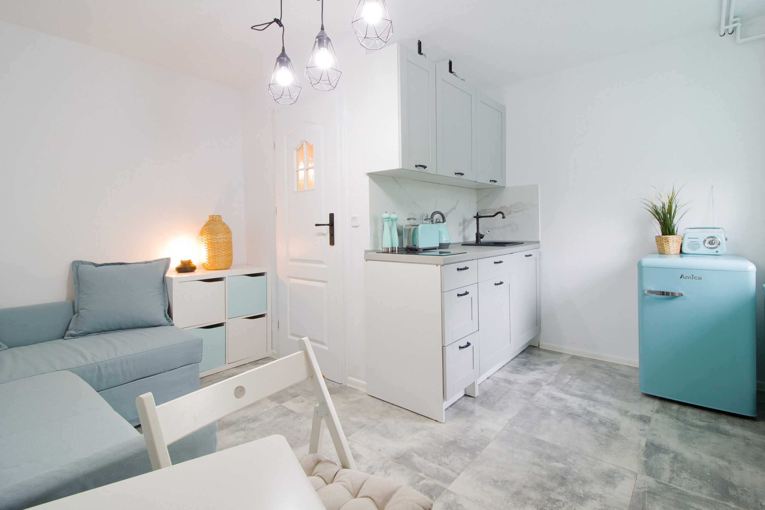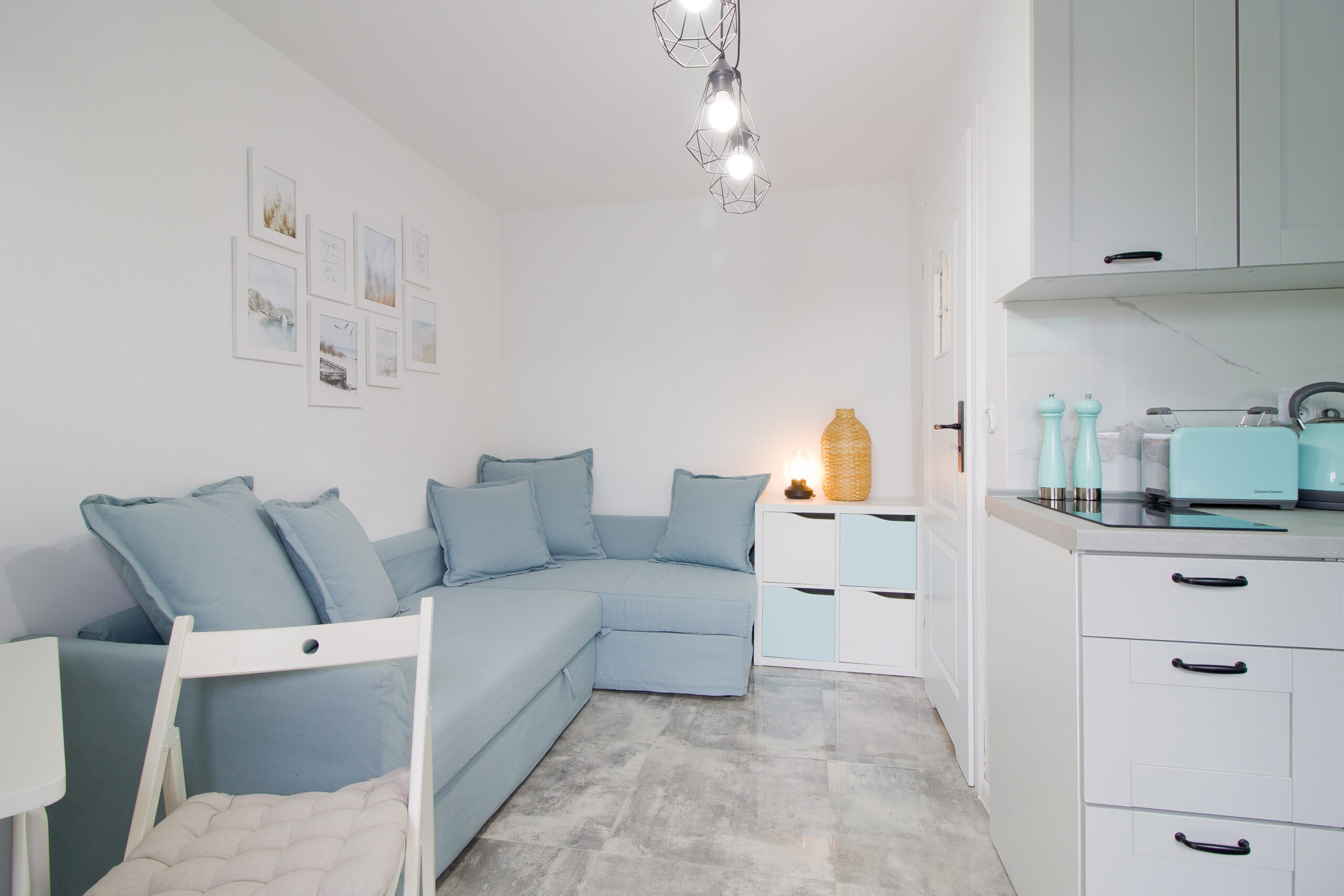 Wnętrze zostało urządzone w bardzo letnim klimacie który podkreślają pastelowe dodatki.
