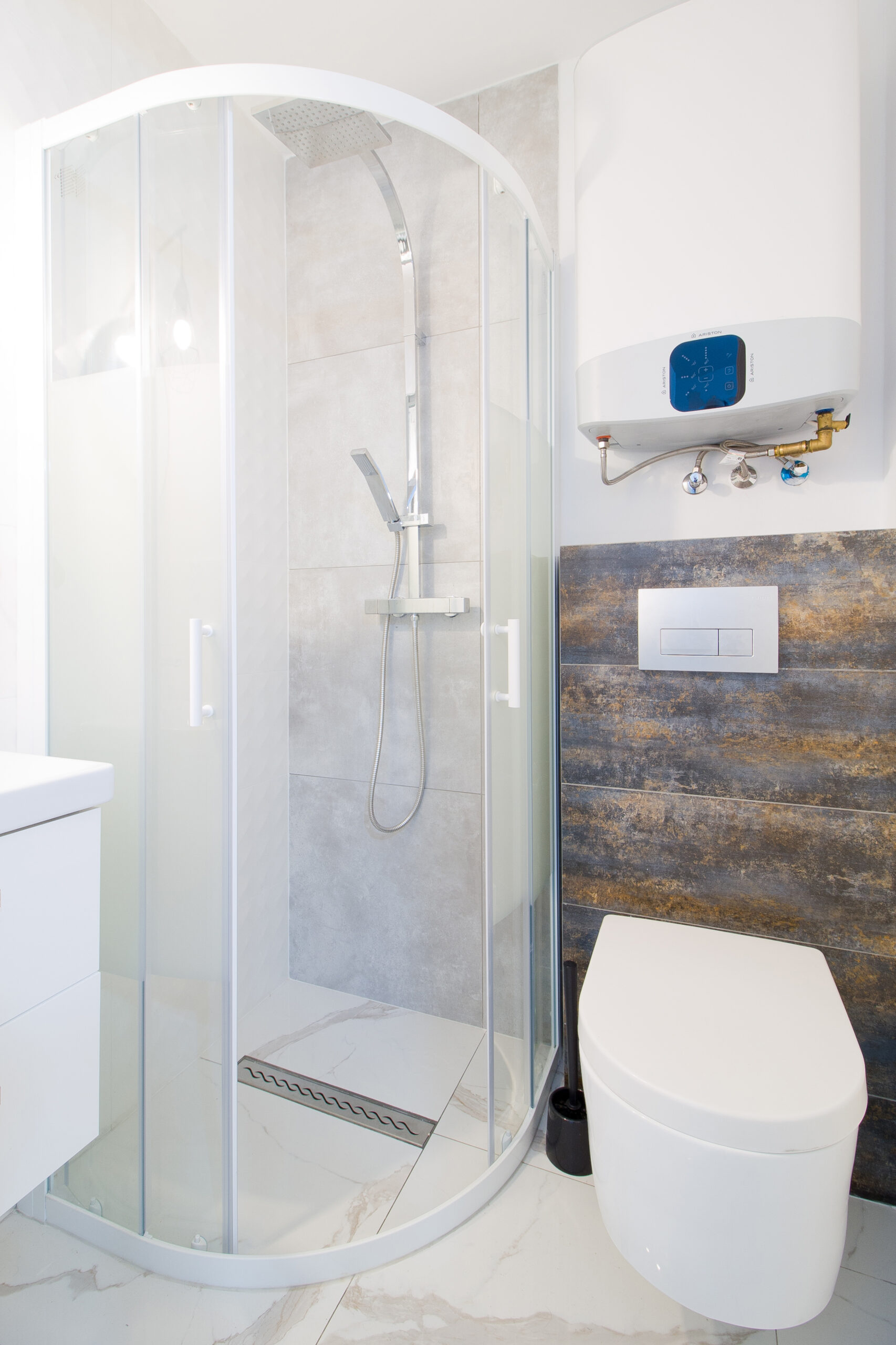 Ta kameralna przestrzeń posiada własny aneks kuchenny wraz z naczyniami oraz łazienkę z kabiną prysznicową.