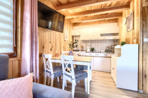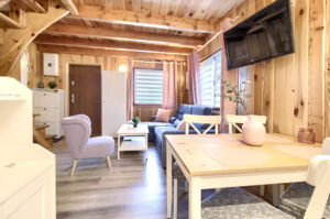 Domek letniskowy to niezwykle przytulne, komfortowe wnętrze wprost idealne do odpoczynku w ciszy i spokoju.