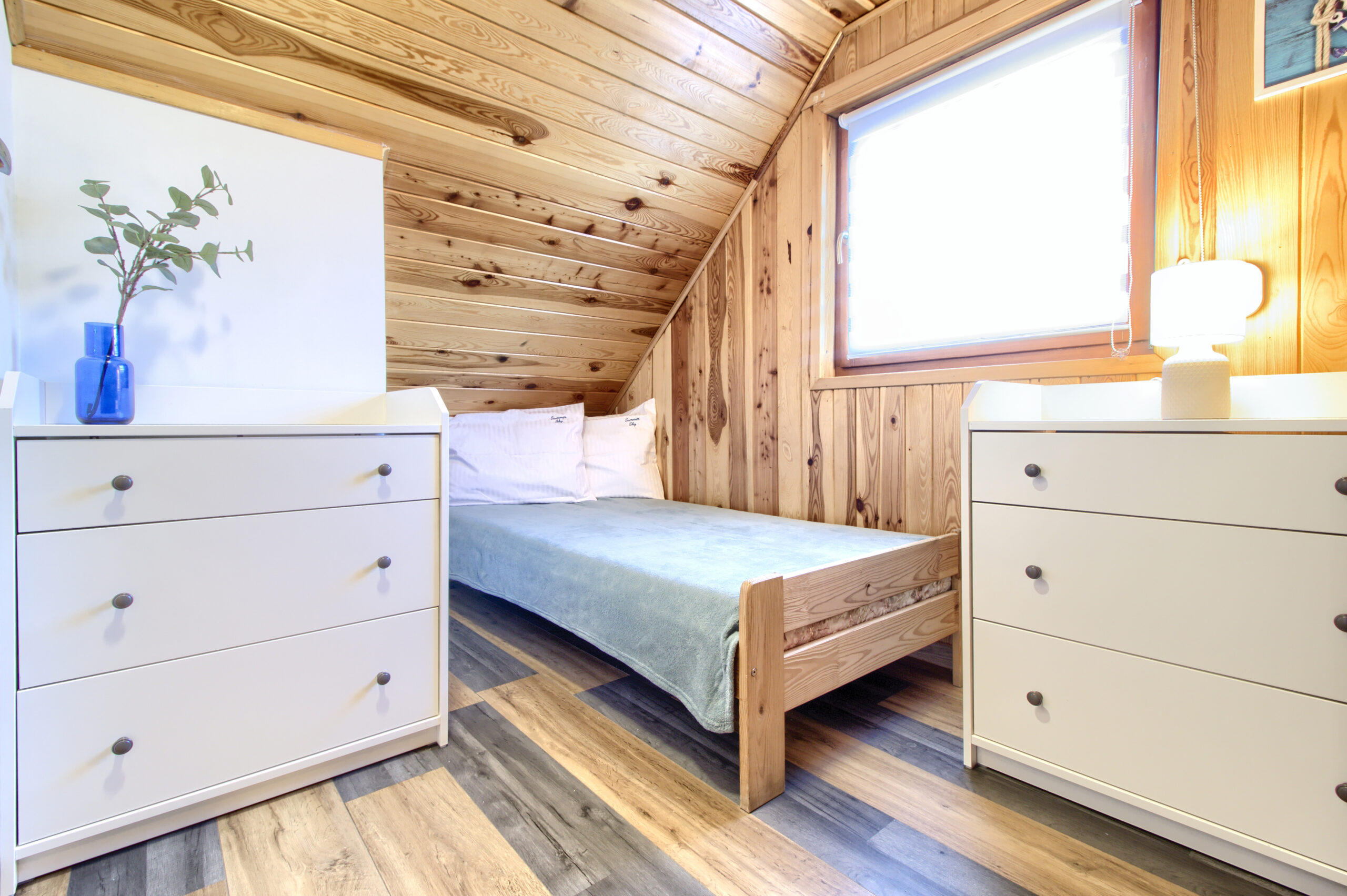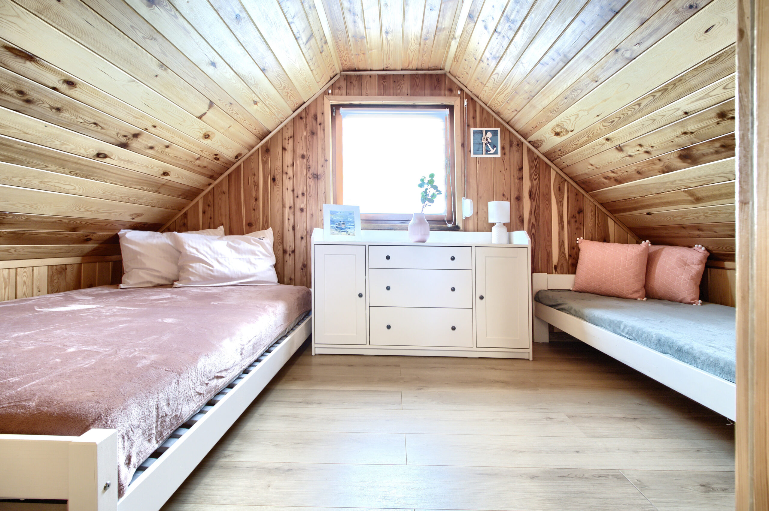 Posiada on dwie sypialnie na piętrze oraz duży salon z aneksem kuchennym i rozkładanym narożnikiem na parterze.